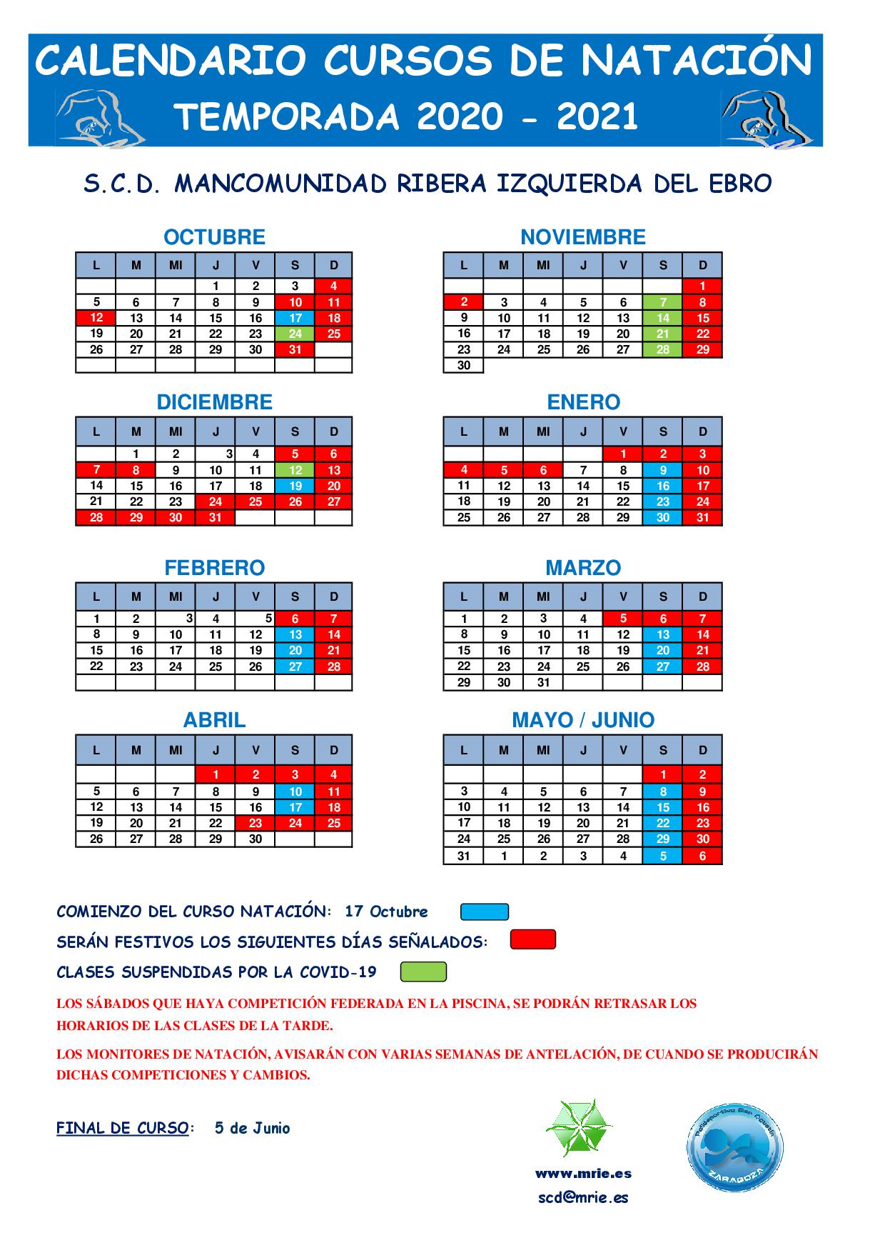 CALENDARIO - CURSOS DE NATACIÓN INVERNAL 2020 / 2021