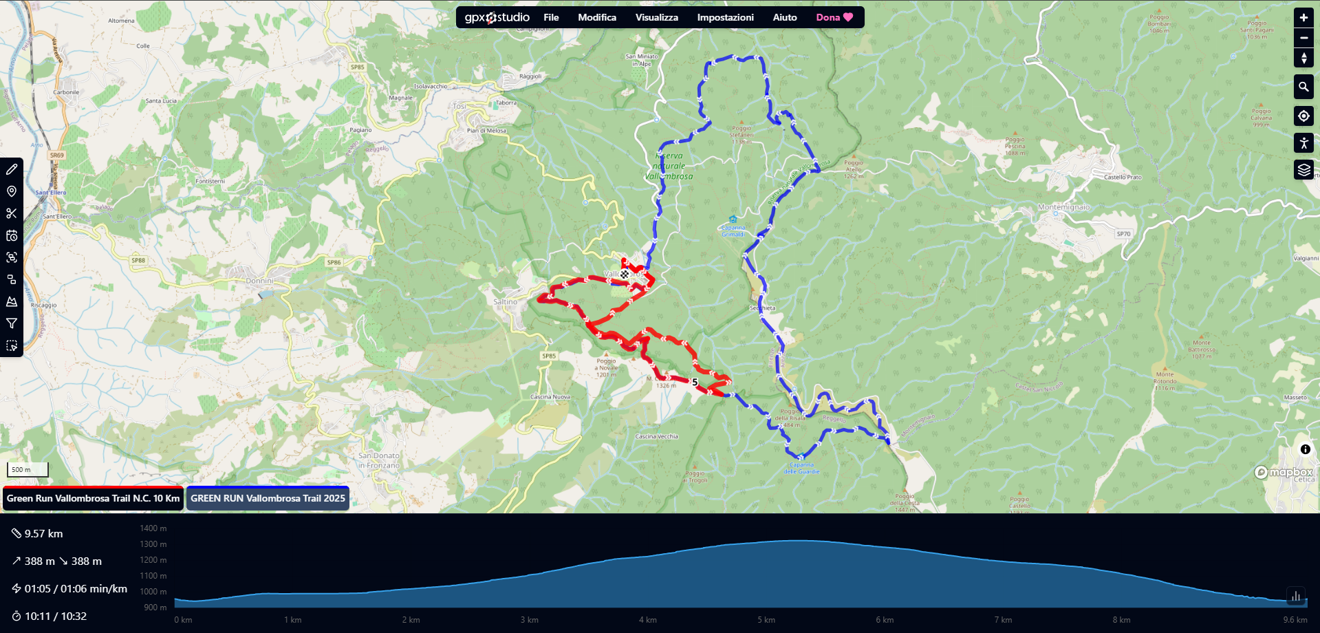 Si parte dallo scenografico Pratone di Vallombrosa (980 m) adiacente alla millenaria Abbazia Benedettina di cui si percorre il perimetro per poi accedere ad un tratto davvero suggestivo all’interno degli Arboreti Sperimentali in cui sono raccolte oltre 1000 specie diverse di alberi e arbusti. Imboccata la strada forestale in località Santa Caterina (sentiero CAI 12), la si abbandona poco dopo a Bocca di Lupo – nome che ci rimanda alla presenza, fra la fauna locale, del raro predatore - per poi percorrere un facile sentiero a mezzacosta (CAI 10A) che, superato un ultimo breve tratto in forte salita, ci porta su strada sterrata lungo i panoramici pascoli del Poggio delle Ghirlande (CAI 13): da qui si può ammirare buona parte del Valdarno Superiore con le fiabesche e misteriose guglie delle Balze, testimonianza di un antico lago preistorico e, più in là, i Monti del Chianti , il Monte Amiata e le Apuane. Giunti in località Macinaia - Km 5 circa - si imbocca il CAI 14 detto “Viottolo del Malpasso” (il nome è tutto un programma...!) che ci condurrà al Bivacco di Capanna delle Guardie: siamo nel cuore dell’Area Protetta della “Foresta di Sant’Antonio”. Ci lasciamo a sinistra il rifugio ed imbocchiamo una strada forestale pianeggiante che ci porta fino alla radura della Croce al Cardeto. Giriamo a sinistra ed imbocchiamo il sentiero di crinale (CAI 00), non molto distante dal Monte Secchieta ed alla quota di circa 1430 metri, il punto più elevato della nostra “cavalcata“. Si prosegue quindi fino a Prato al Ceppo; proseguiamo fino al Rifugio Giuntini dove si trova il “cambio staffetta” e da qui, sempre sul sentiero di crinale, scendiamo fino al Valico di Croce Vecchia. Pochissimi metri di asfalto e poi di nuovo su sentiero (CAI 7) fino ad incrociare ancora una volta una strada forestale: la si percorre fino alla Mandria dove svettano, da oltre 60 metri, le piante più alte d’Italia!! Giunti al Metato – antico podere vallombrosano – si prosegue per gli ultimi 4 Km di gara che riporteranno i partecipanti al traguardo del Pratone.