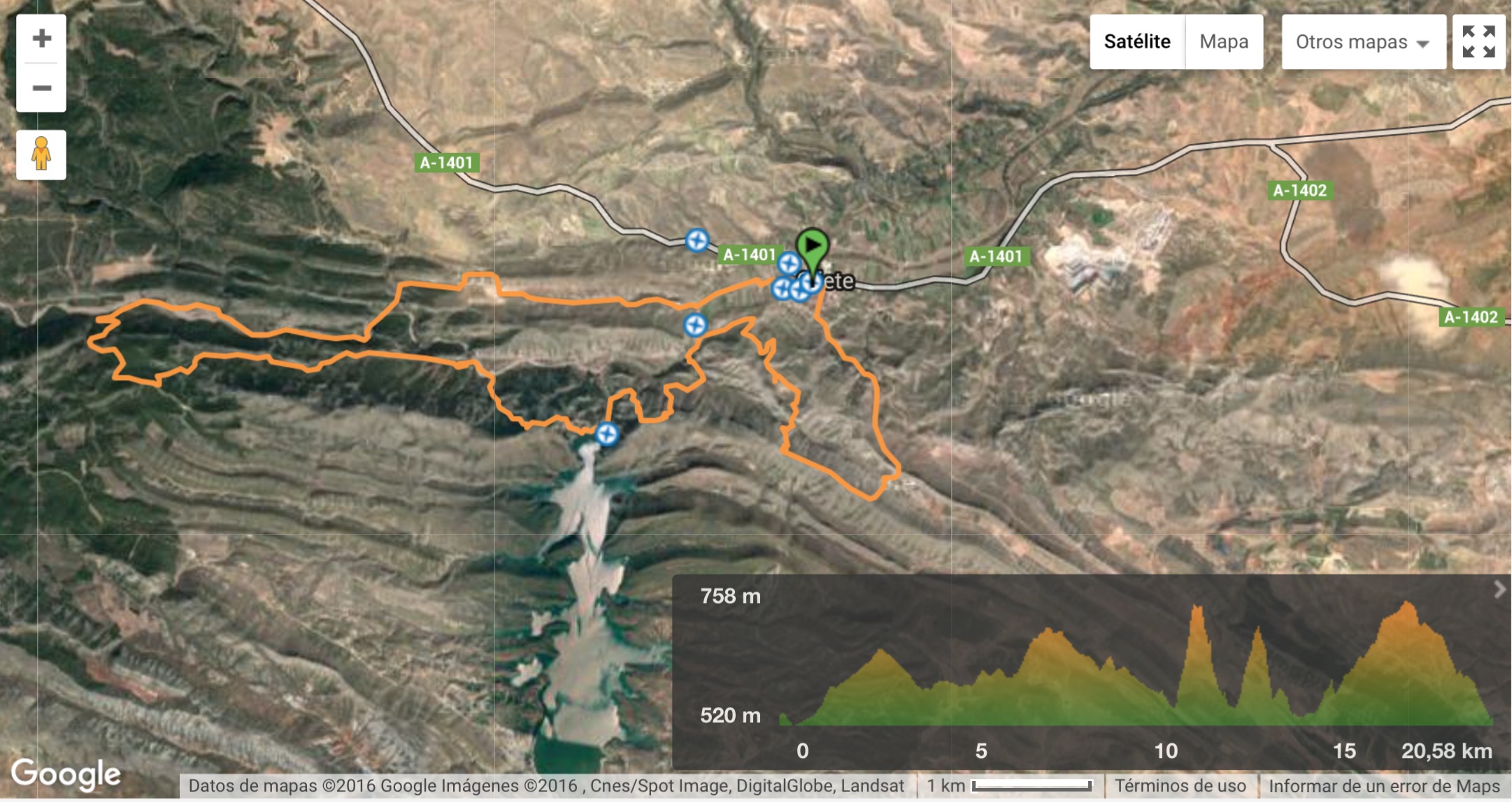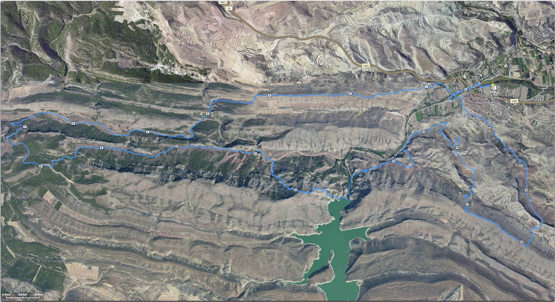 Cruzamos al otro lado del barranco para ascender de nuevo hasta los Collados en el cual se encuentran caminos que unen a los pueblos de Alcaine y Oliete y donde haremos nuestro primer avituallamiento solido( km 8). Descenderemos por senda a la hilada de Fantobas(campos de cereales)pasando por la paridera del Clemente, hasta encontrarnos nuevamente con el Rio Seco, para en solo 150 mts. empezar el ascenso radical al pico del Cabezo Malvin, pasando por una antigua cantera de piedra que abasteció a la presa para su construcción (1903-1923), en su cima podemos contemplar unas preciosas vistas del pantano, de los pueblos de alrededor y de nuestros queridos buitres leonados que son un emblema de esta zona ( estamos en el punto más alto de la carrera km 12.5 y 787 mts de altitud). Descendemos hacia la presa por una bajada muy técnica debido a la verticalidad con piedras sueltas y tras cruzarla bajamos sus peculiares 272 escaleras para seguidamente encontrarnos con el segundo avituallamiento solido (km 13.5), donde se juntan las dos pruebas para continuar el mismo trazado hasta meta. Haciendo un recorrido rompe piernas pasamos por la casas de los ingenieros que en tiempos residían allí, luego continuamos hacia el Palomar(palomar deteriorado) y seguir ascendiendo hasta la cima al otro lado de la presa y pasando por encima de olivares aparecemos en la carretera del pantano, junto a los merenderos, y allí alejándonos otra vez del rio y de la Canal (construcción que daba regadío a una parte de la huerta) vamos al encuentro , por senda señalizada, desde la Rocha del Cuervo al Barranco de la Tía Chula, donde reciben el nombre sus pinturas rupestres y un calendario solar muy peculiar.